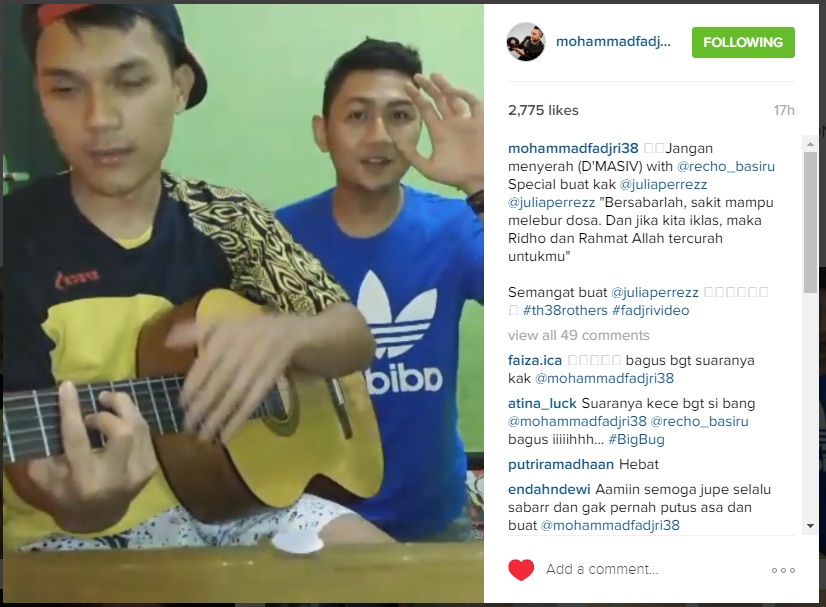 Fadjri memposting nyanyiannya berasama polisi bernama Reyco Basiru di akun instagramnya.
