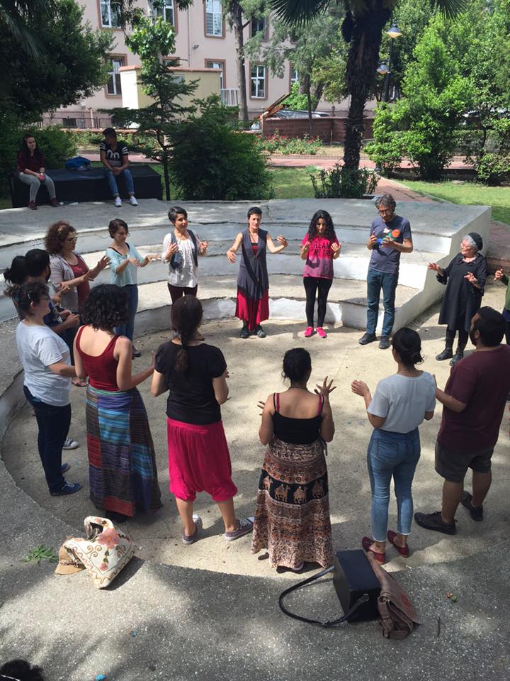Atölyenin yönlendiricisi, Esra Yurttut, dansçı ve koreograf. Esra'yı farklı atölyelerde izleme, etkinliklerine dâhil olma imkânı buldum. Ondan öğrendiğim bir şey var. Herkesin içinde ben olmayı sürdürmek ancak ben olurken biz ile de akışta kalmayı başarabilmek. Bunu yapmak için kelimelere ihtiyacımız olmadığını sadece beden hareketlerini izleyerek, göz teması kurarak bunu yapabileceğimizi fark etmemizi sağlıyor. İçimizdeki dansı ararken bakmamız gereken yer burası. Benim çıkardığım sonuç bu, en azından.