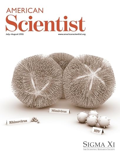 The other day I got the July issue of American Scientist and was tickled to no end to see this portrait of mimiviruses on the cover. As I write in A Planet of Viruses, mimiviruses were literally hiding in plain sight for years. Scientists considered them to be bacteria because they were too big to be viruses (see the minuscule HIV and rhinovirus, the cause of colds, for scale). It turns out they are indeed viruses, and perhaps the most interesting viruses on Earth. They may even represent an ancient branch of the tree of life, reaching back several billion years.