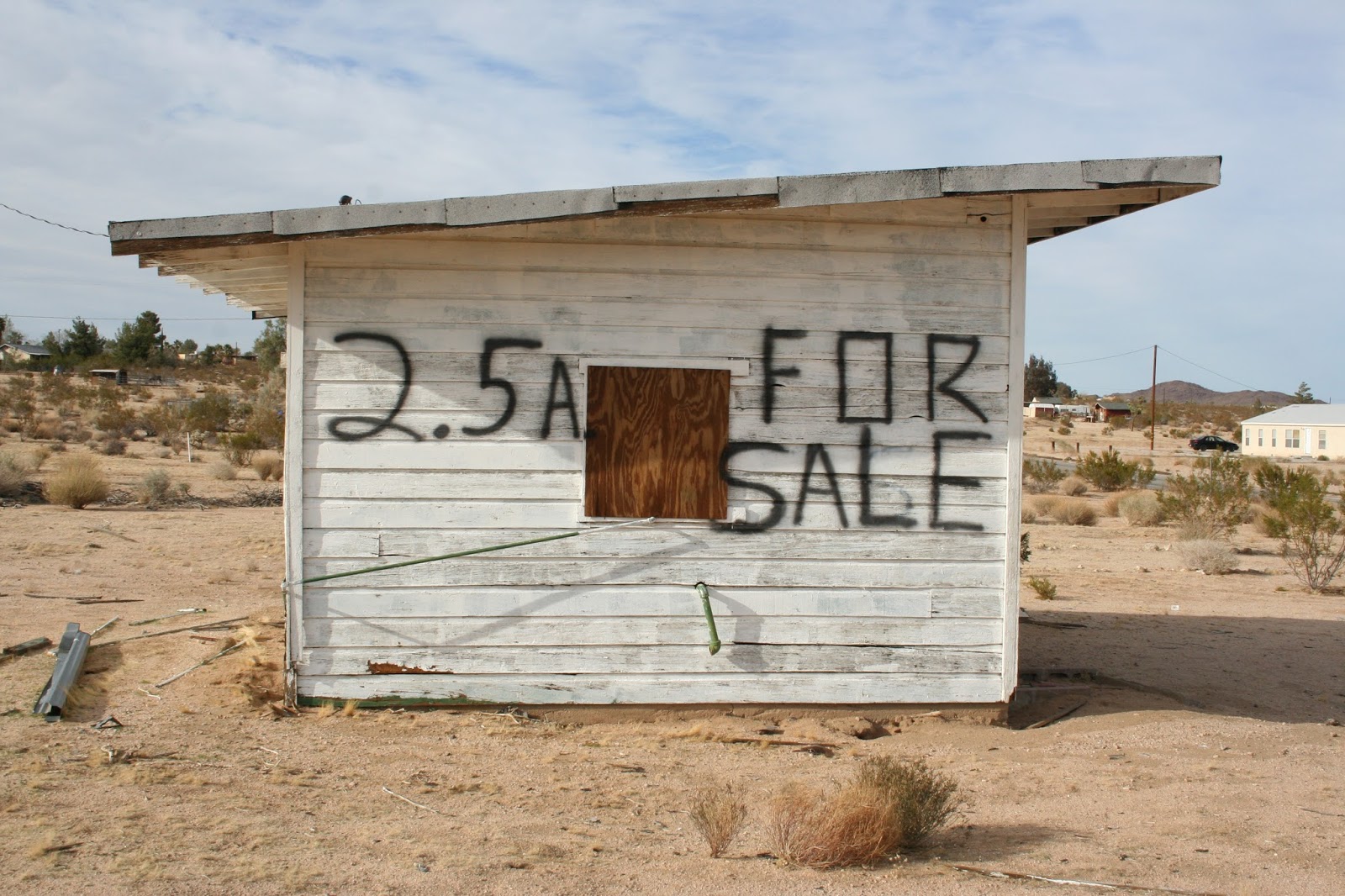 The realtor’s ad showed it to be the last property at the end of a dirt road, which had its appeal—nobody driving past your front door. And so I made a little desert field trip to go look at the cabin. After a drive along increasingly rutted and sandy roads, I spotted the place in the distance, and I could also see another house on the road, a sprawling, tattered, but apparently inhabited thing, with collapsed outbuildings, a number of wrecked cars, and a sea of detritus surrounding it: building materials, pipes, scrap metal, chunks of wood, oil cans, domestic appliances. A Noah Purifoy might have taken this junk and made any number of fine sculptures from it. But the inhabitant of the house had no such plans, unless he was creating an installation on entropy and chaos theory.
