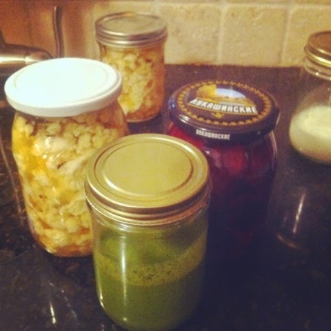 1. Fermented vegetables. Not quite pickles, since most pickling methods involve vinegar. These only need Lactobacillus to kick off lactic fermentation - lactic acid keeps the pH low and thus prevents harmful bacteria (Clostridium botulinum being the deadly one) from growing. On the pic above, there are two jars of cauliflower and one of beets, but pretty much anything can be fermented - carrots, cabbage, peppers, tomatoes etc.