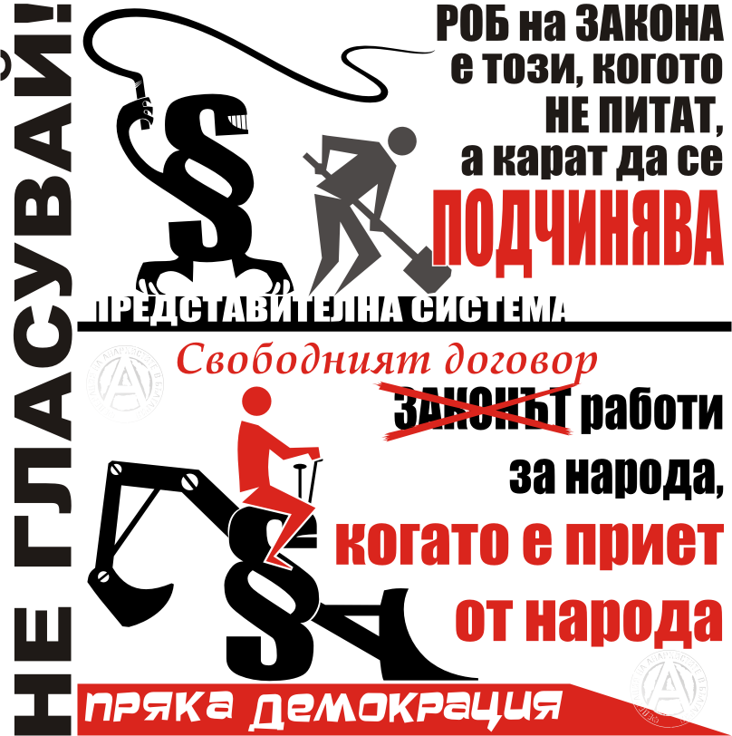 Нека спрем да гълтаме стръвта "изберете по-малкото зло" - голямото зло възниква тъкмо от примирението с малкото. Навиците за подчинение, затвърждавани от участието в изборите на представителната система, не оставят място за появата на нови навици сами да се грижим за себе си, сами да пишем и променяме правила, за които всеки човек има съвест да различи правилното от грешното, тоест да постави "закона" в единствено справедливата му позиция - ДА СЛУЖИ НА ХОРАТА, не обратното, както е сега (и то само на теория, понеже, казах го вече, върхушката управници всякога е над закона).