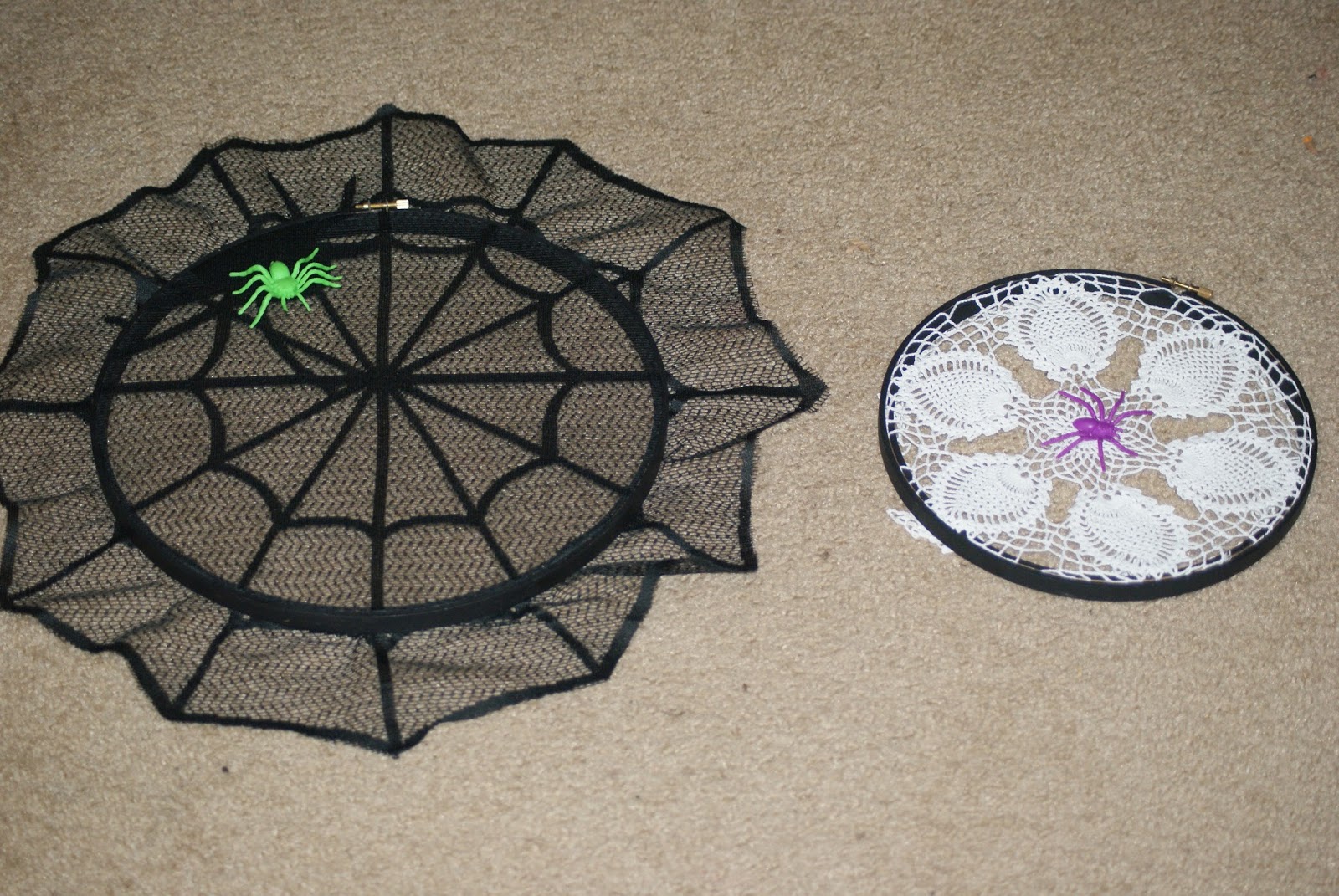 I did not do the ribbon yet (didn't have on hand) but will by Halloween! I just love them. The black doily is available also at Joann's. It actually has a spider weaved into it, but my hoop was too small to show it, so I just glued a spider onto it. I'm visualizing several of these inside my home. Different sizes, hanging together to add to that Halloween ambiance...