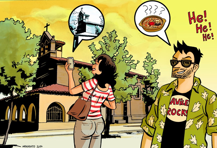 Mi querido personaje protagonista, Pablo Díaz-Strasser, hace un poco de de turismo por Avilés. Aunque está más pendiente de la fabada que se comerá después que de la Ermita de la Luz. Este dibujo es mi contribución precioso calendario que ha patrocinado la Concejalía de Educación y Juventud de la ciudad para promocionar las próximas Jornadas de Cómic.