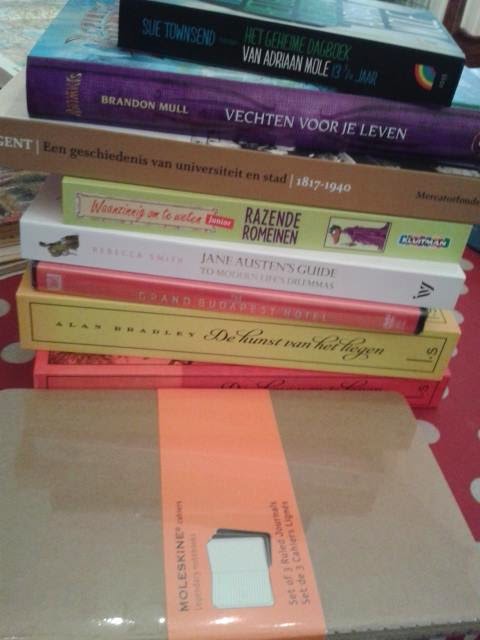 Gisteren een halve dag naar Gent gereden. Vakantie in eigen land maakt dat zelfs regendagjes niet zo erg zijn. En het werd een leuke namiddag: browsen in een heerlijke boekhandel (ook met een hypo, gelukkig serveren ze daar chocolademelk) en daarna nog een andere winkel in voor de spelletjes voor zoon- en manlief. Oogst van de dag zie je hieronder, boeken voor mij (Jane Austen, Alan Bradley, Gent), boek 'Vechten voor je leven' voor dochterlief, Adrian Mole (nostalgie!) en Razende Romeinen voor zoonlief en dan zag ik nog de film Grand Budapest Hotel staan. Couldn't resist.