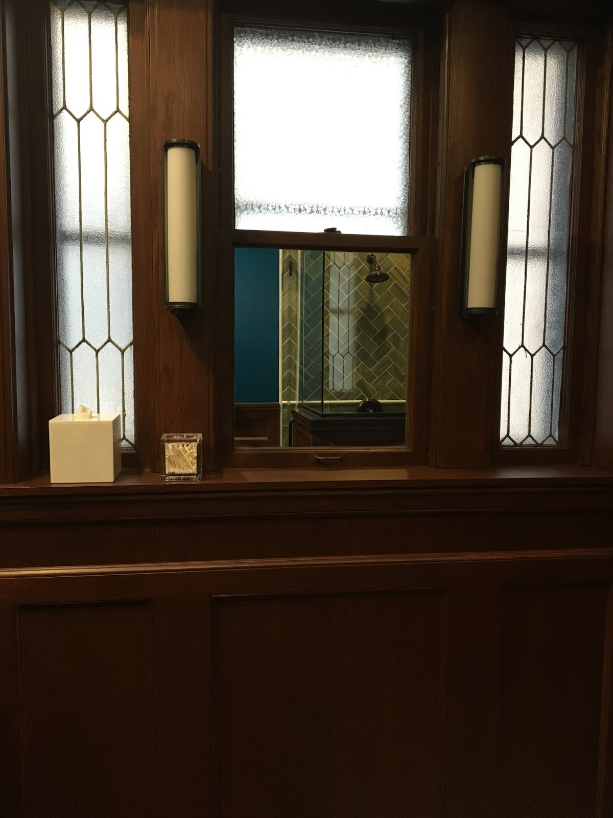 I also knew that I loved the wainscot detail on the walls of the white bathroom, but that tile was not going to be the right choice for a more formal space. We toyed with the idea of marble slabs, but while period appropriate, that would have been egregiously expensive. But the other period appropriate choice was wood. Now, I have to point out that while this is a full bathroom, so there is a shower in it, it will only be used as such during such times as we have a 100% full house with everyone needing to shower at once. Something that might occur once or twice a year. If this were going to be a full-time bathroom, I would be very reluctant to do wood wainscoting, since the moisture would be a big issue. If you love the look of wood, but need to be able to shower in your bathroom daily, look into some of the naturally water-resistant woods, like Ipe. They will be more expensive up front, but will save you from warping and cracking issues down the road. Lucky for us, we could go with white oak, which is the predominant wood in all of our original millwork. Our amazing contractors were able to design a pattern for the paneling that pulled details from the original woodwork, and once it was stained to match, you would never know it wasn't original to the building!