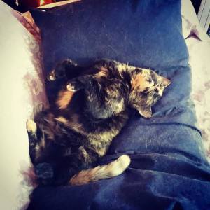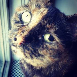 My fuzzy muse is a nine year old tortoiseshell named Francis. She’s a she, though many people mistake her for a boy because I guess Francis is a boy’s name? (She’s named after an old friend, who is male, but it’s his last name.) Almost all tortoiseshells are girls because their coloring comes from the X chromosome. I got her has a kitten, and she’s always been a rather small cat, if you don’t count her circumference.