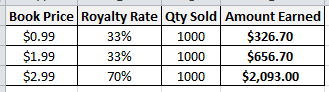 theoretical earnings on 1000 books sold at various price pointsFor most ebook sellers, going below $2.99 means dropping into a special 33% royalty bracket as opposed to the usual 70% or so. The per book earning power of a book at $2.99 is 6x greater than that of a book priced at $0.99 while not being 6x more expensive.