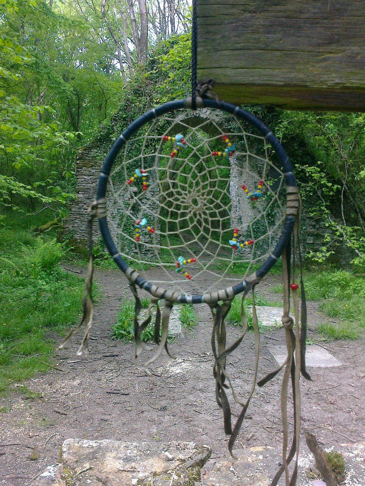 Bluebells and ferns sprang from the stones of the altar, and someone had hung a dream-catcher from the crucifix. In the earth floor of the chapel were three grave-slabs, recent burials from the mid 1940s, presumably of some previous owners of the wood. 'And in that sleep of death, what dreams may come...?' Maybe the dream-catcher helps. Or maybe in this woodland setting, they sleep sound.