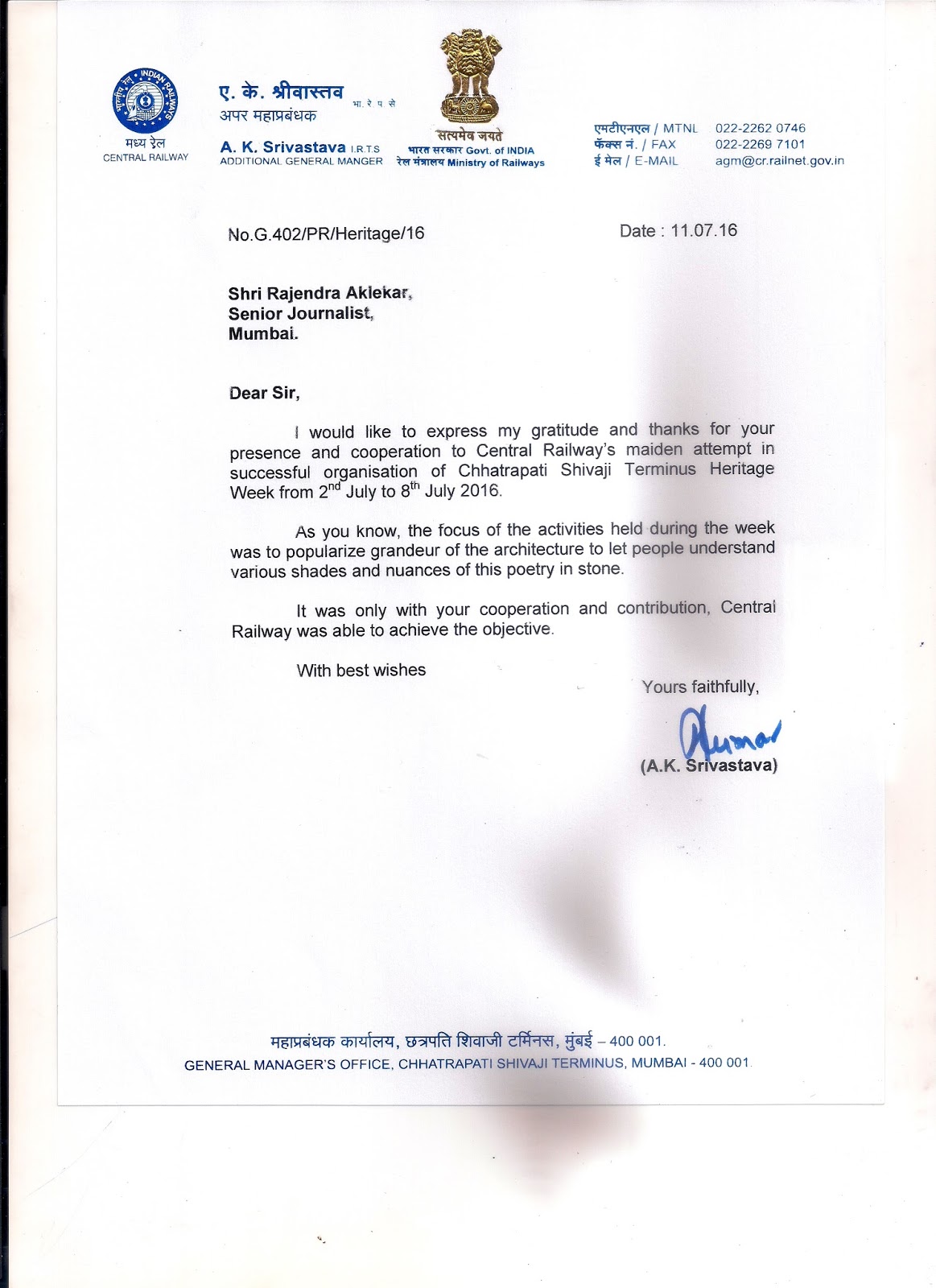Am touched by this kind gesture of Additional General Manager AK Srivastava, Central_Railway for my contribution to Mumbai