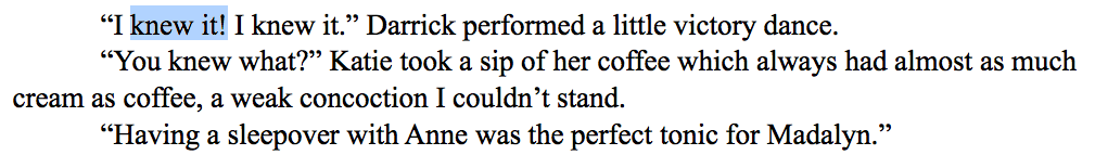 Yet, despite my best efforts there were times when an exclamation point was really needed to convey the way the words was spoken. Take for instance, "Merry Christmas!" is the normal way to greet someone (on Christmas day at least), and if I had just written "Merry Christmas." then the readers would get the impression that Madalyn wasn't actually excited about Christmas. And yeah, we couldn't have that. So, here are some examples of the exclamation points I kept: