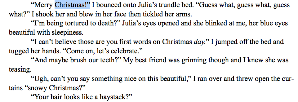 Yet, despite my best efforts there were times when an exclamation point was really needed to convey the way the words was spoken. Take for instance, "Merry Christmas!" is the normal way to greet someone (on Christmas day at least), and if I had just written "Merry Christmas." then the readers would get the impression that Madalyn wasn't actually excited about Christmas. And yeah, we couldn't have that. So, here are some examples of the exclamation points I kept: