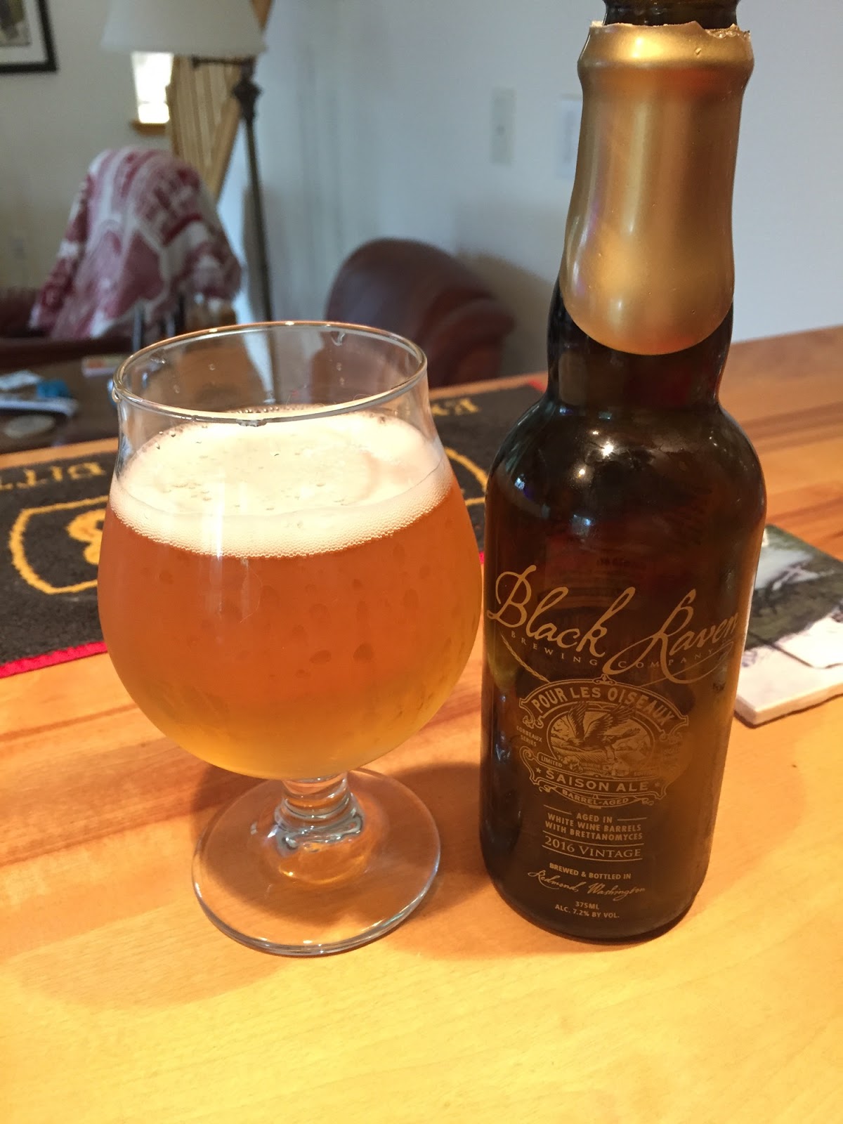 Black Raven Brewing's Pour Les Oiseaux Saison: We've been getting more and more beers here in Alaska from this brewery in Remonds, WA. This one is a saison dosed with brett. It poured a hazy gold with a small white head that dissipated to a collar. The nose has some hints of brett funk along with light citrus notes. Carbonation was good and the mouthfeel was light. On the palate there was oak, brett funk, and some moderate bitterness, that fell away to a nice , long finish. A nice beer now, but I'm very curious as to what 6 to 12 months in the cellar will allow the brett to do to it. 7.2% ABV.