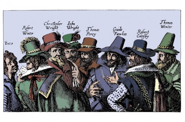 Guy Fawkes and the Gunpowder Plotters, 1605. Contrary to popular belief, Guy Fawkes was not executed for masterminding the Gunpowder Plot. (Photo by Print Collector/Getty Images)