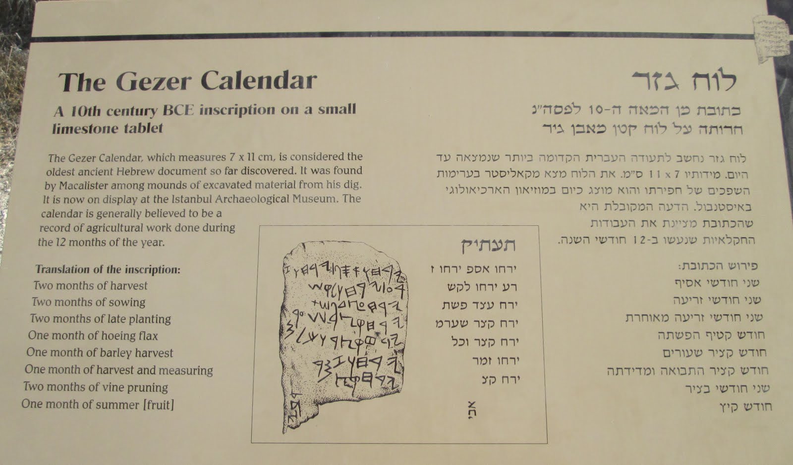 The Gezer CalendarThe world’s oldest calendar is found at Gezer in Israel. It counts the days in this way: “Two months of harvest, Two months of sowing, Two months of late planting, One month of hoeing flax, One month of barley harvest, One month of harvest and measuring, two months of vine pruning, One month of summer.” The calendar is important so the farmer gets his timing correct.