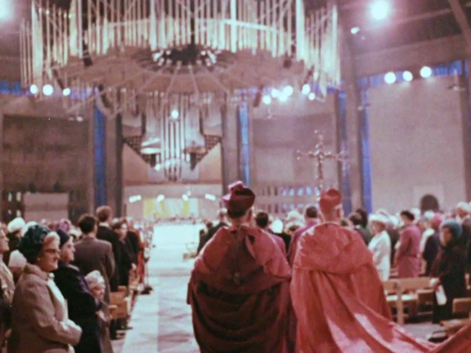 The circular crown design, its spectactular wrap around stained glass and the dramatic realisation of the form with its diagonal buttresses makes an instant impact, and it's as beautiful inside as it is outside. It's a much more extravagant design than is usual with Gibberd, who while adding decorative touches in his more typical buildings, is also usually rather restrained.
