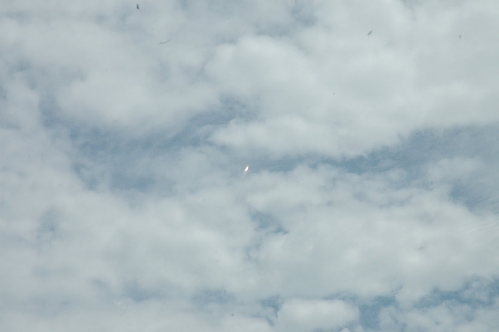 The man standing next to me looked up and shouted, "Godspeed." The term used back in the early days of manned space flight, a Middle English expression, a wish for success and fortune for one setting out on a voyage, adventure, or travels. The Atlantis disappeared behind the clouds for a brief moment. As it broke out into the blue, the sounds of the its thrust finally reached the ground around us and provided a brief feeling of the power involved in sending humans to space.