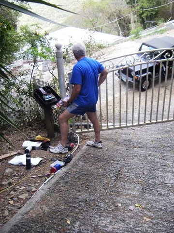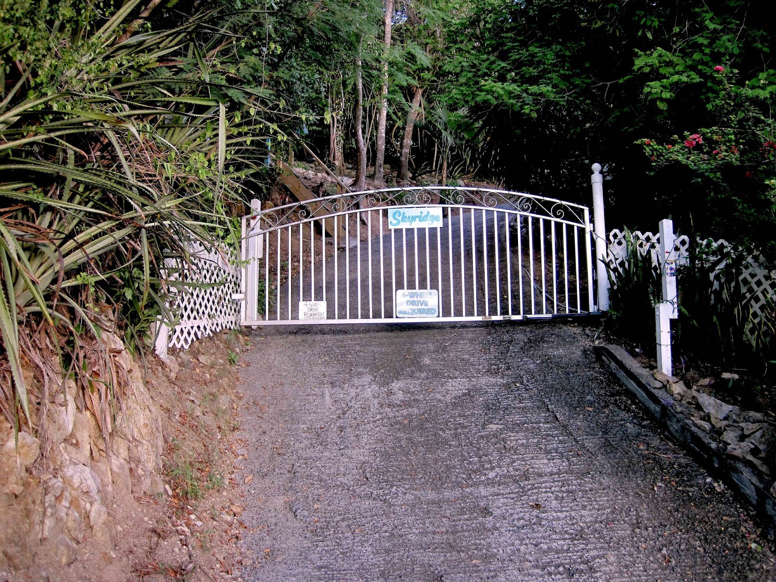 The Gate at Skyridge When we became the owners of the house and property we came to call Skyridge in St. John, U.S. Virgin Islands, it had no gate at the entrance to its driveway which is approximately a mile long (OK, maybe fifty yards) and tilted essentially vertical (it honestly feels that way). Instead of a gate, we found a tangle of ugly orange plastic mesh stretched between two trees. This was, so we were informed, meant to keep the wild donkeys and goats from getting in which was an understandable precaution. The wild donkeys, lovable as they are and icons of the rich history of St. John, are not very good guests because they eat all the flowers within reach of their cute little muzzles and grinding teeth which leaves not only denuded gardens but enormous, stinky poop piles. As for the goats, they also eat the vegetation but have the further habit of falling into swimming pools and drowning. Goat corpses floating in one's pool are not what one wants to wake up to in the morning. The plastic mesh was the previous owner's idea of protecting the property against the armies of donkeys and goats that regularly make forays into the Upper Carolina neighborhood of Coral Bay. That meant every time we wanted to go anywhere, I had to hike down the driveway and pull the mesh back and then, after driving the car through, get out and stretch it across the driveway again. When we returned, the process had to be done in reverse, pulling the mesh back, driving up the driveway to park, then walking down to pull the mesh across the driveway again and tying it off. Not only did it require the stamina of your average Olympic long-distance runner but the mesh was ugly as sin and, anyway, didn't always work. The donkeys and goats often just hopped over it or mashed it down and came on up to see what they could see and eat what they could eat. That invariably meant many hours of work cleaning up donkey and goat poop, not to mention having to get new plants. Fortunately, no goats drowned after hopping the mesh but chasing them away was a pretty daunting exercise. Far faster and nimbler than any human, they were quite willing to be chased around the house as many times as I was able and still be ready to give it another go. Ultimately, it always took Linda and me in a coordinated effort similar to calling a Hail Mary play in a pro football game to get them headed down the driveway. One morning, even before we had time for a cup of coffee, we looked out from the deck and saw six goats in the driveway, contemplating life and our flowers. We rushed to defeat them. "You go left, I'll go right, yell, clap your hands, and herd them!" I cried as the goats looked placidly on, only reluctantly moving after we came after them. Even when we got them going more or less in the right direction down the driveway, they simply scattered into the trees, there to meander and giggle to themselves while probably also calculating how they might get into the pool to drown. Eventually, we got them down the driveway and I pulled the mesh tight. Hot and sweaty, I climbed back up the driveway to sit down on the steps and give the problem some thought, not the immediate goat problem but the problem problem. After a bit, I proudly announced to Linda my solution. "What we need is a gate!" "We have a gate." "That's a strip of mesh. I mean a real gate. You know, built out of maybe aluminum. With real hinges so it swings open and closed." "Sounds expensive," she said. "It will also be expensive when I die of a heart attack going up and down the driveway or we have to drain the pool to get out a dead goat." She pondered that. "It would have to be a pretty big gate and you'd still have to go up and down the driveway to open and close it." "No I wouldn't. I'll get an automatic gate opener." I cracked open my laptop and showed it to her, a tubular device bolted to a fine looking gate. A man and a woman were standing beside it. They were smiling and looking generally ecstatic about their gate and its opener. "Behold," I said grandly, "the Heaving Horse, the finest little gate opener in all the land." Linda peered over her reading glasses at the screen. "The Heaving Horse?" "That's its name." "Is that really its name?" "You betcha." Note to readers: It's not actually its name but I'm just trying to be nice here. "I know a fellow who will build the gate for us," I went on. "I don't know . . . " "Oh, come on. You worry too much. Trust me, it'll be great!" Linda arched an eyebrow but then nodded her assent and, before long, that fellow delivered up a fine big aluminum gate hung on a steel post. I was so proud. "I thought there was going to be an automatic gate opener," Linda said from the car as I trudged down the driveway to swing open our fine new gate. "The Heaving Horse has been ordered," I said over my shoulder. "I will install it the next time we come down." Indeed, just as I claimed, after we returned to Huntsville, the Heaving Horse arrived in a package. I peeked at it, saw it looked exactly as it did on the company's website plus also a black box filled with electronics and some power cordage. I didn't read the instructions in its thick manual. I was confident I would figure it all out when I got back to St. John. When we next arrived, I got busy installing the Heaving Horse. My buddy Wayne came over and inspected the assembly. "Where's the battery?" he asked. "We don't need a battery," I said. "We'll hook it up to the house power." "I think it has to operate off a battery. Look there in the control box. See that slot? That's for the battery." I shook my head and triumphantly held up the power cord coming out of the box. "This takes AC power. See? It says right here in the manual. Or at least, that picture shows it." Wayne took the instructions away from me and stared at the picture, then read the words beneath it. "Homer, what the electronics does is take the AC power to pump up the battery, and then the battery opens and closes the gate