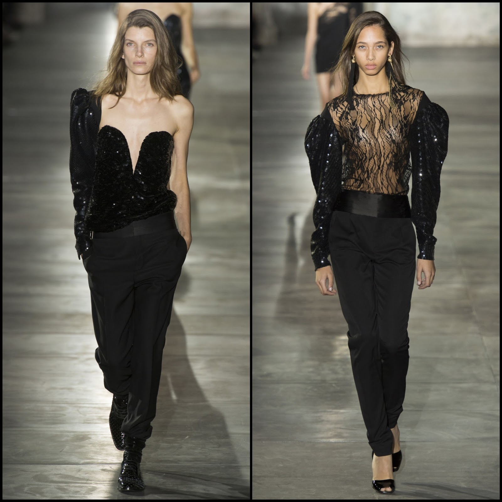 WHAT: Saint Laurent Spring/Summer 2017. This collection is the debut of newly-appointed Creative Director Anthony Vaccarello after Hedi Slimane's departure. Vaccarello is known for his super-sexy vixens and he continued this at Saint Laurent with definite nods to the MASTER, Yves Saint Laurent and his design icons of Le Smoking Tuxedo Jackets, Transparent Blouses, Gold Lame and Animal-printed Dresses.