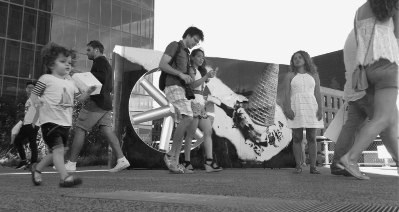 Colombian writer Lilián Pallares (standing still) on the High Line, New York, 11 September 2016. Sculpture is Sunbathers II by Kathryn Andrews, 2016.