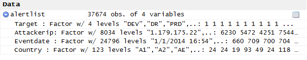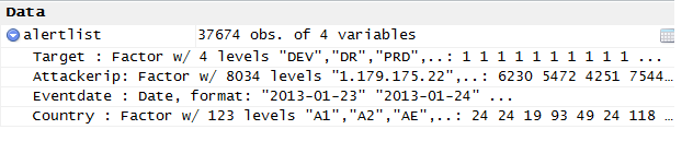 Column one is the targeted SSH system (I'm giving them some cryptic names here based on asset classification), the attacker's IP, the date/time of the alarm and the GEOIP lookup. Nice. I could pull this into Excel and bang away at it, but instead I'll yank into R for some deep analysis.