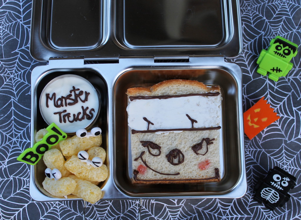 MONSTER TRUCKS vanilla yogurt with chocolate decorationfrightful mac'n'cheese puff creatures of the nighta Little Blue Bus sandwich with jelly, (s)cream cheese and chocolate-