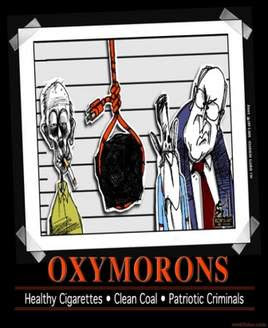 What about onomatopoeia? Gulp, murmur, and splash are examples of this tool; they are words that mimic the sound they represent. And how about a great oxymoron, a contradiction in terms that actually makes sense in an odd sort of way. For example: jumbo shrimp, Little Big Man, military intelligence (my favorite), or the ones in the cartoon below: