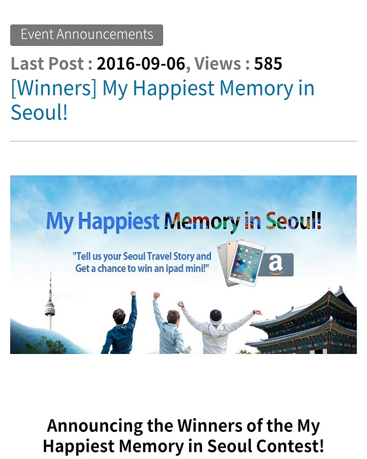 A month ago, I found out that my writing won one of the grad prizes in the "My Happiest Memory in Seoul" contest organized by Visit Korea. I was on the way back to KL actually, after a week of work, and were not yet passed the Gombak toll booth when I found out from the Visit Seoul's announcement page.