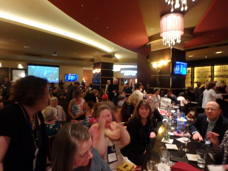 Saturday morning, I attended another fun panel. This one was on spying and included my pal John Lawton. I was so excited for my Pittsburgh Sisters in Crime Mary "Liz Milliron" Sutton and Paula Smith for making it into Blood on the Bayou, the Bouchercon anthology, I couldn't wait for the signing. I know how hard they've worked and it's great to see that hard work rewarded. I had to rush from the anthology signing to my own panel. The Henery Press gang met for drinks in the very crowded and very loud bar. Then I headed down the street to my friend Ellen Byron's new book launch party. That's me and Eleanor Jones helping with promotion. And for me, that wrapped up my New Orleans experience. I retreated to my room to pack for my early flight home. Thanks to everyone who worked so tirelessly to put this convention together. It was a blast!