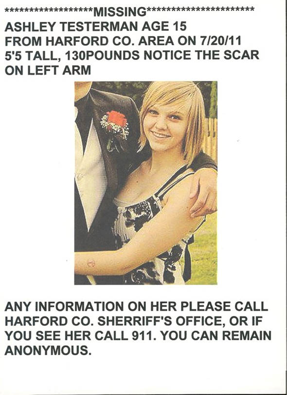 Anyone with information about the whereabouts of Ashley Testerman is encouraged to contact the Harford County Sheriff's Office at 410-838-6600 or by dialing 911.Article from- http://www.daggerpress.com