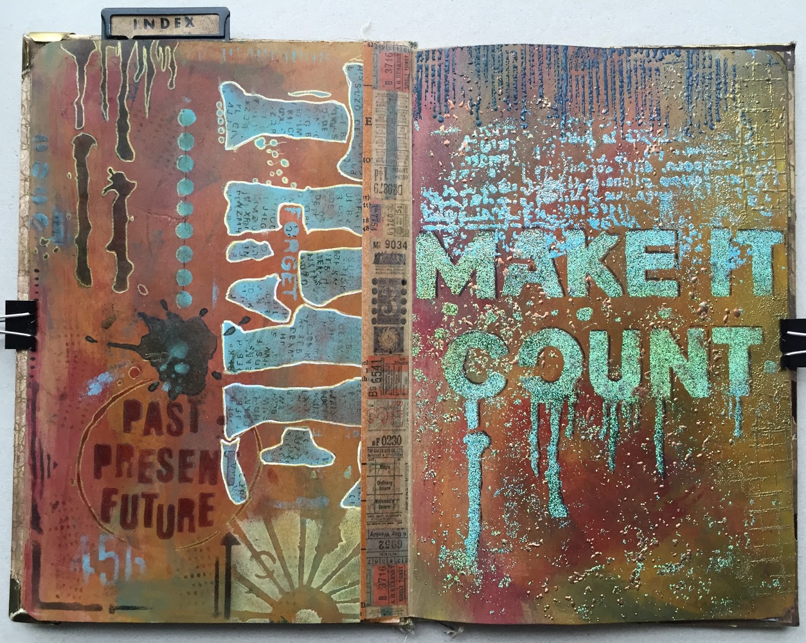 The theme of the issue is Books with a Purpose and the sample I created is a compendium of mixed media techniques.