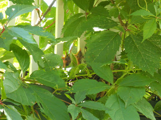 For several days, Mama Robin kept going back and forth with worms, and we stayed away. Early one morning (still dark), Kim and I woke to the loud, angry chirping of birds. Kim rushed out and almost stepped on one of the baby robins. Apparently Mama Robin had decided it was time for her babies to leave the nest. A cat slunk nearby, stalking the babies, and the adult birds were putting up a fuss to keep it away. Kim scared the cat away, and all was at peace. Later that morning the nest was empty.