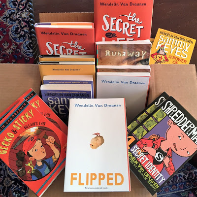 Instead, I'm doing a giveaway for teachers / librarians (or educators of any kind). It'll be a box of books with duplicates of assorted (signed) titles, some paperback, some hardcover--whatever I can cram inside the box. The idea is that the winner keeps one copy of each title for their classroom or library, and gives the duplicate titles away to students at their school. Get one, give one.