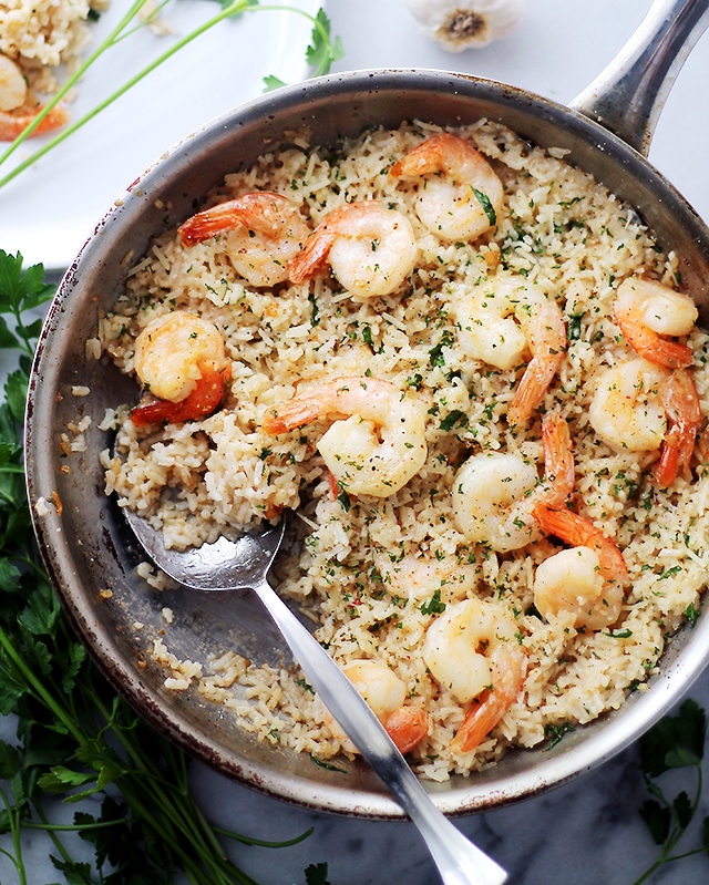 3 tablespoons vegetable oil1 small onion, chopped2 cloves garlic, chopped1/2 teaspoon turmeric1 medium tomato, chopped1 small carrot, diced1/2 red bell pepper, dicedKosher salt and freshly ground pepper1 pound large shrimp, peeled and deveined1 1/2 cups converted white rice1 tablespoon chopped fresh parsley1/2 cup frozen peas, thawedHot sauce (optional)Heat oil in deep skillet over medium heat. Add onion, garlic, turmeric; cook until onion is soft, 3 minutes. Add tomato, carrot and bell pepper; cook, stirring until tender, 5 minutes. Sprinkle with 3/4 teaspoon salt, and pepper to taste. Add shrimp and cook, stirring, until they begin to turn pink, 1 minute. Add rice, 2 cups water, and 1/2 tablespoon parsley; bring to boil. Reduce heat, cover and simmer until rice is tender, 15-20 minutes. Remove from heat; sprinkle in peas and remaining 1/2 tablespoon parsley. Cover 5 minutes. Fluff with fork; add peas and parsley. Season with salt and pepper. Serve with hot sauce.