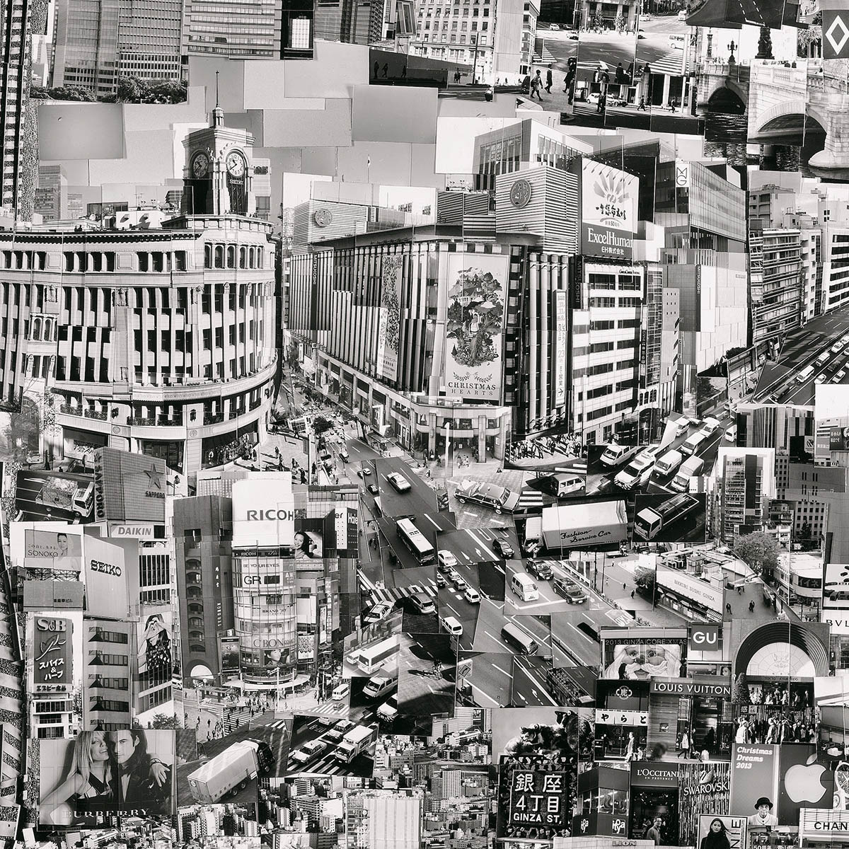 Nishina prints off contact sheets, cuts out single frames, and assembles them into a large-scale collages that looks somewhat like a map, somewhat like an aerial view of the city. These collages are then rephotographed and printed large scale, and this print is the final product.