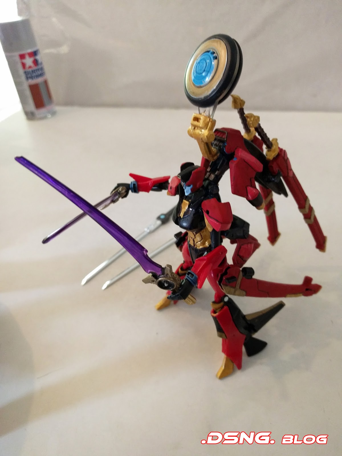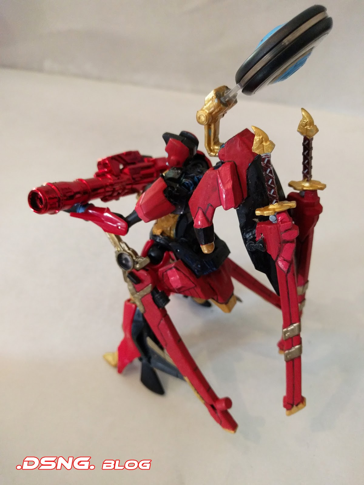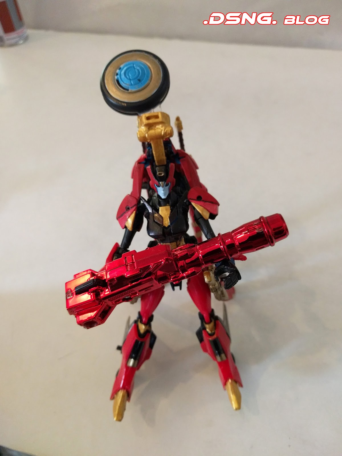 All right, this fembot is one of my favs... and you'll have to check out the before and after pics, to truly appreciate what happened in the final custom job.There were actually 3 fembot Transformers sacrificed to create the final product [two Windblades "red" and one Chromia "blue"], in addition to Gundam parts and a borrowed heavy blaster cannon from Generations Leader Jetfire.
