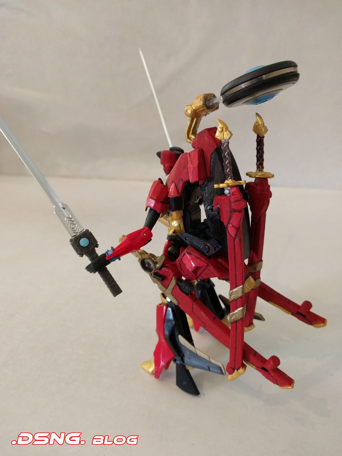 I honestly did not like the Windblade toy when I first saw her. But after the custom kitbash job, she became one of my favs. And for those who are curious: no, she can't transform. She is a cool display piece, and that's what I wanted to make. Also, I didn't give her a golden face, since it just didn't look right per my tests... but now, the blue gem in the sword matches her blue face and the top of her rear motorcycle wheel. The colors used for the paint job were two shades of gold, two shades of red, brown and black. And the rear windshield on her back, which was fully transparent like glass [made from white plastic] had to be painted fully black, inside and outside.
