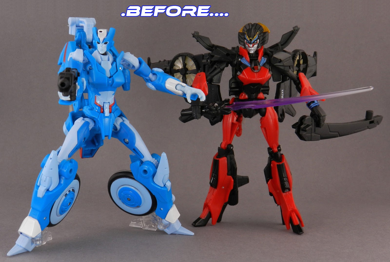 Her former slightly transparent sword was colored fully purple, and I had two of them from the two Windblade base models [they are now holstered at her hips].