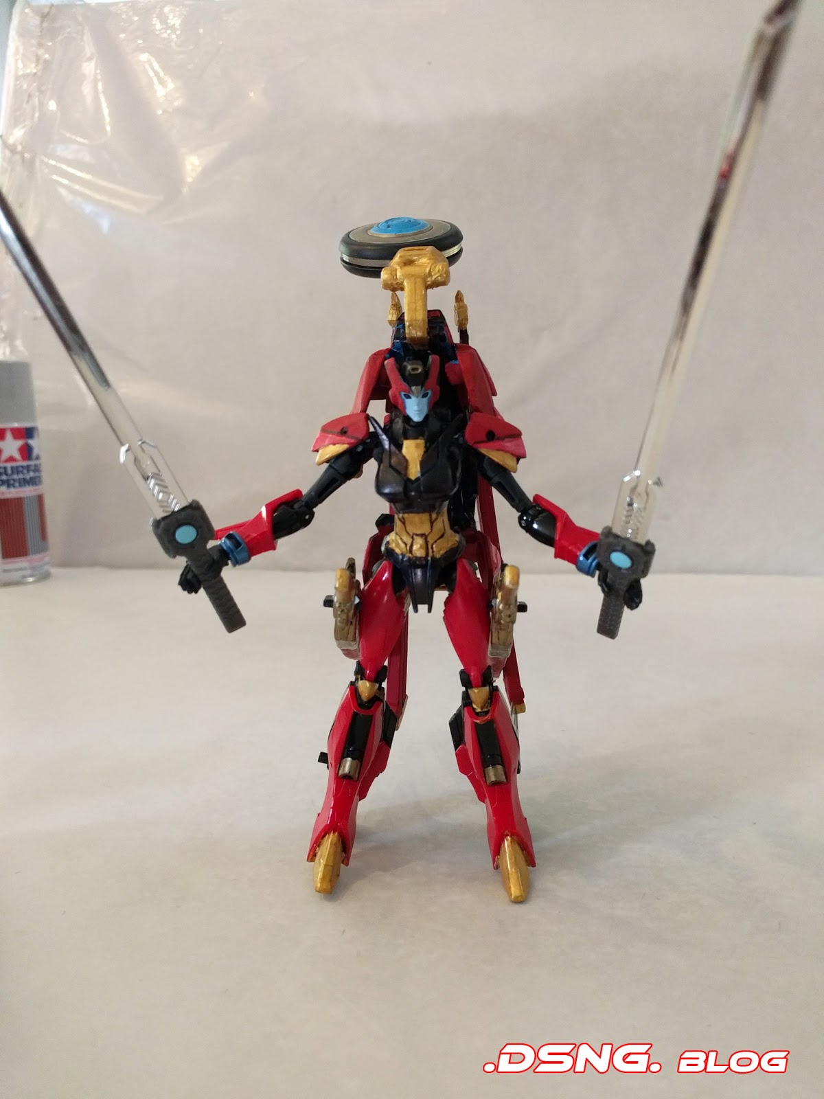 Also, I thought of adding a ninja-like golden Optimus Prime mouth-guard to her... I dunno if I'll still do it. Such small things can easily be created from the plastic case that comes with the toy, when you utilize a curved corner and cut it down to size and then glue it onto her face, to cover her mouth... I got that tip from another veteran toy customizer. Over the course of this year, I've also learned to use other small household items to customize TF weapons [making hem bigger or longer], and that sort of endeavor is quite cool and takes some creative thinking ;)
