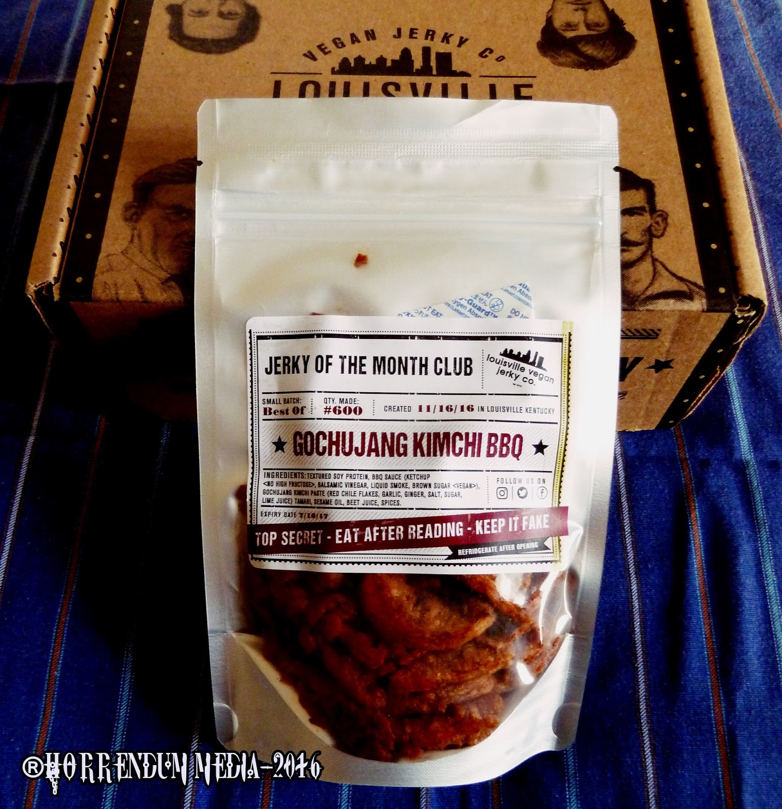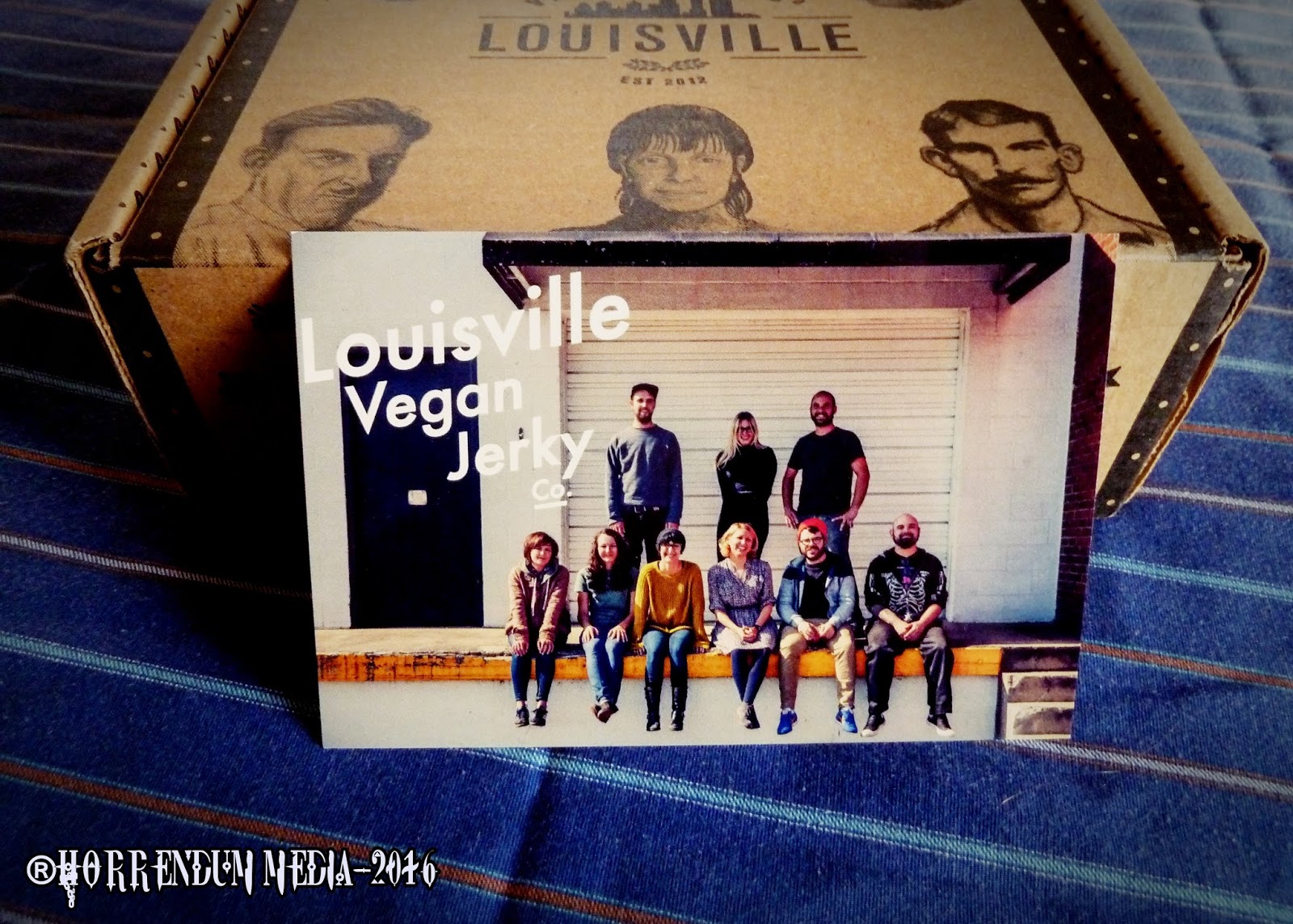 This month's Louisville Vegan Jerky subscription came early, which made me happy. I love this jerky. Here's this month's card: a group photo of the employees of LVJ. The only person missing is me! Just kidding, but I do love this jerky.