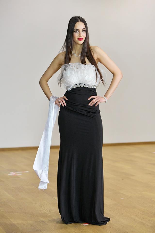 Belgium Amina Serroukh: Bless her heart. That's pretty much all I can say in a nutshell. Amina wore this black and white gown with an iridescent ruffled top section and silver sequined trim straight from the Downtown LA Santee Alley fabric trim bins.