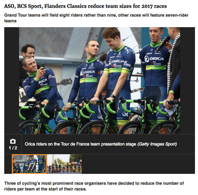During the General Assembly of the International Association of Cycling Race Organizers (AIOCC), the three groups decided to decrease team rosters from nine to eight in the Grand Tours and from eight to seven in their other events. This new policy will go into effect for the 2017 season.
