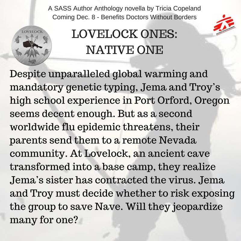 Tricia Copeland Lovelock Ones: Native OneDystopian YADespite unparalleled global warming and mandatory genetic typing, Jema and Troy’s high school experience in Port Orford, Oregon seems decent enough. But as a second worldwide flu epidemic threatens, their parents send them to a remote Nevada community. Lovelock is an ancient cave a group has transformed into a base camp. With Jema’s sister’s life in the balance, she and Troy must decide whether to risk exposing the group to save her. Will they jeopardize many for one? Find out in Native One, a young adult novella.
