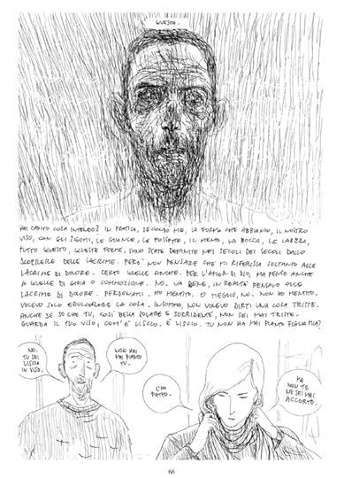 В “Зле нарисуваният мой живот” приключих с миналото: след него нещата тръгнаха по-добре и вече печелех достатъчно, за да не живея като персонаж от собствените си истории. Още ми тежеше багажът от тийнейджърските години и вероятно несъзнателно съм искал да се отърва от него. “Зле нарисуваният мой живот” беше приет много радушно, даже прекалено. Продадоха се 40000 бройки, абсолютен рекорд в историята на комикса в Италия, и нещата продължиха да се променят, а аз радикално се откъснах от предишния си живот. Само дето в новия не виждах нищо за разказване. Когато “отлепиш от нулата” по каквато и да е причина, замогването ти сякаш върви и с някаква наложена от обстоятелствата слепота – спираш да виждаш нещата или ги виждаш от такава дистанция, че не можеш да участваш достатъчно, за да ги превърнеш после в разказ. За мен погледът на човек, който има вила в Тоскана, а разказва за бедната младеж, не струва пукната пара... Какво е това, телепатия? Да виждаш кой какво прави и чувства в съседната стая, без въобще да влезеш в нея? И стана тя каквато стана: тъкмо си бях изградил собствен език върху определена основа, тя изчезна, а онова, което я замести, не биеше на нищо.