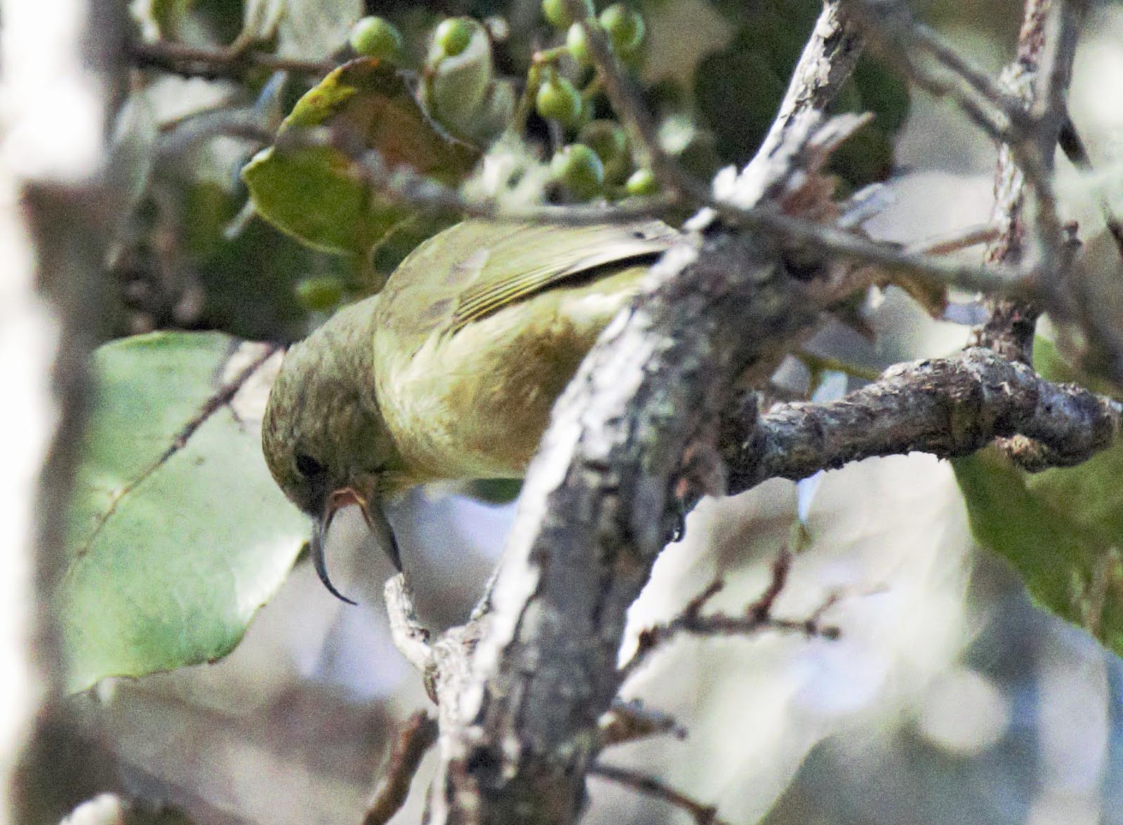 What a crazy looking bird.  Sadly maybe 800 are left but as I noted, they eat a single larvae from a specific bug on ohi'a trees.  This is a younger bird.  They act a little like woodpeckers.  A very tough bird to find.  They have home ranges in the hundreds of acres so need a large territory.