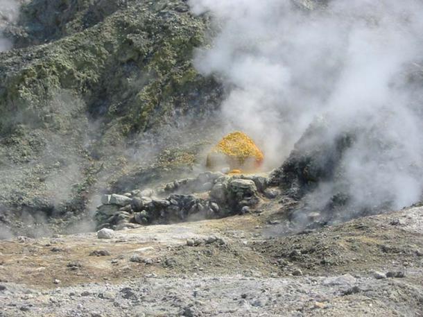 Sulfur in a burning landscape at Campi Flegrei near Naples, Italy ( Wikipedia photo /Donar Reiskoffer)