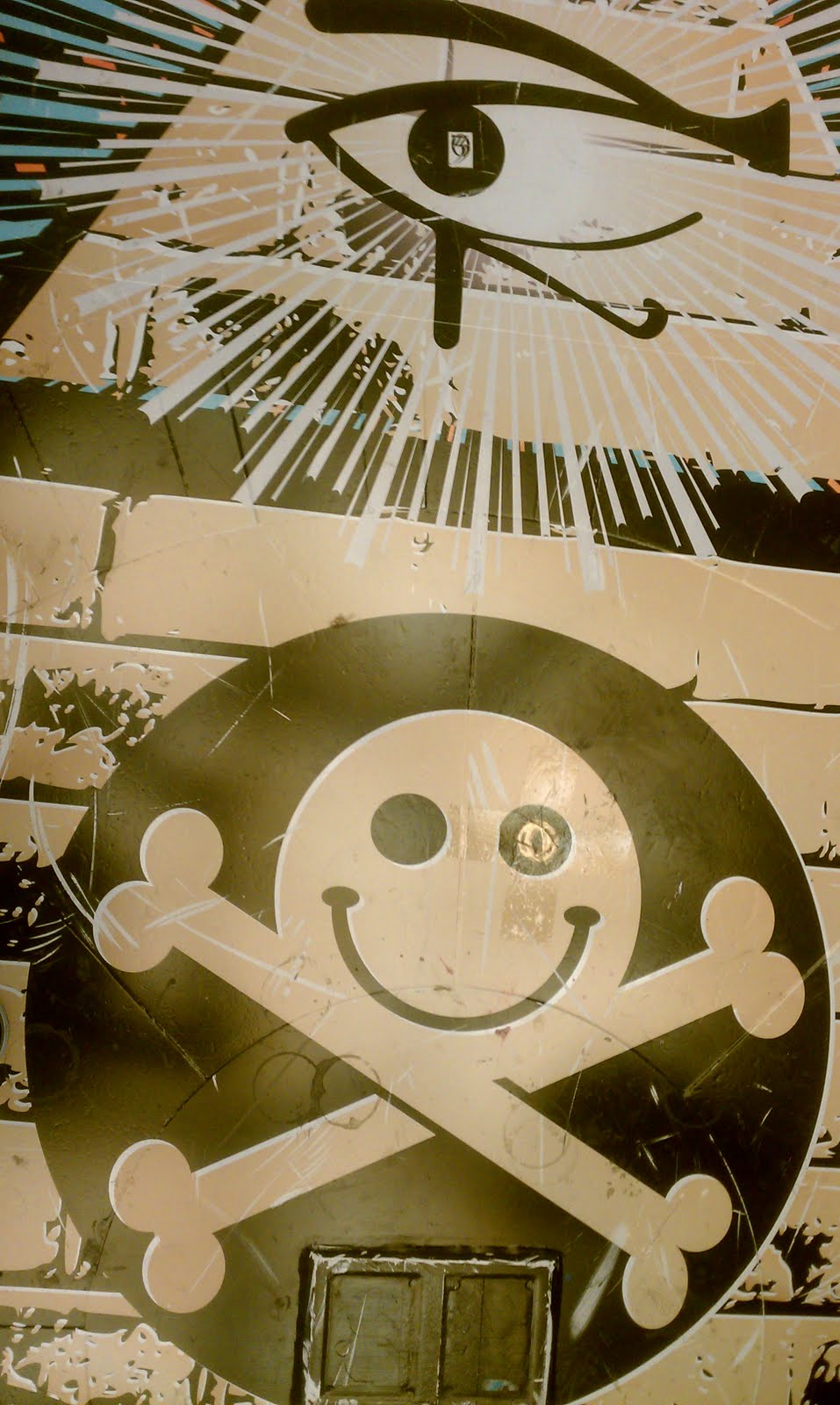There were a number of other clues we never used.  Most we didn't even spend much time on, and a few of them I kept in the back of my mind.  Something kept niggling me.. that "where the eye lacks message".  On Sunday, the rotunda wheel got a few additions.  Most had been kicked off by foot-traffic by the time we got there (someone told us about it, and I saw the tape).  The Eye of Horus had a sicker of the "33" tattoo design from the program, and this: