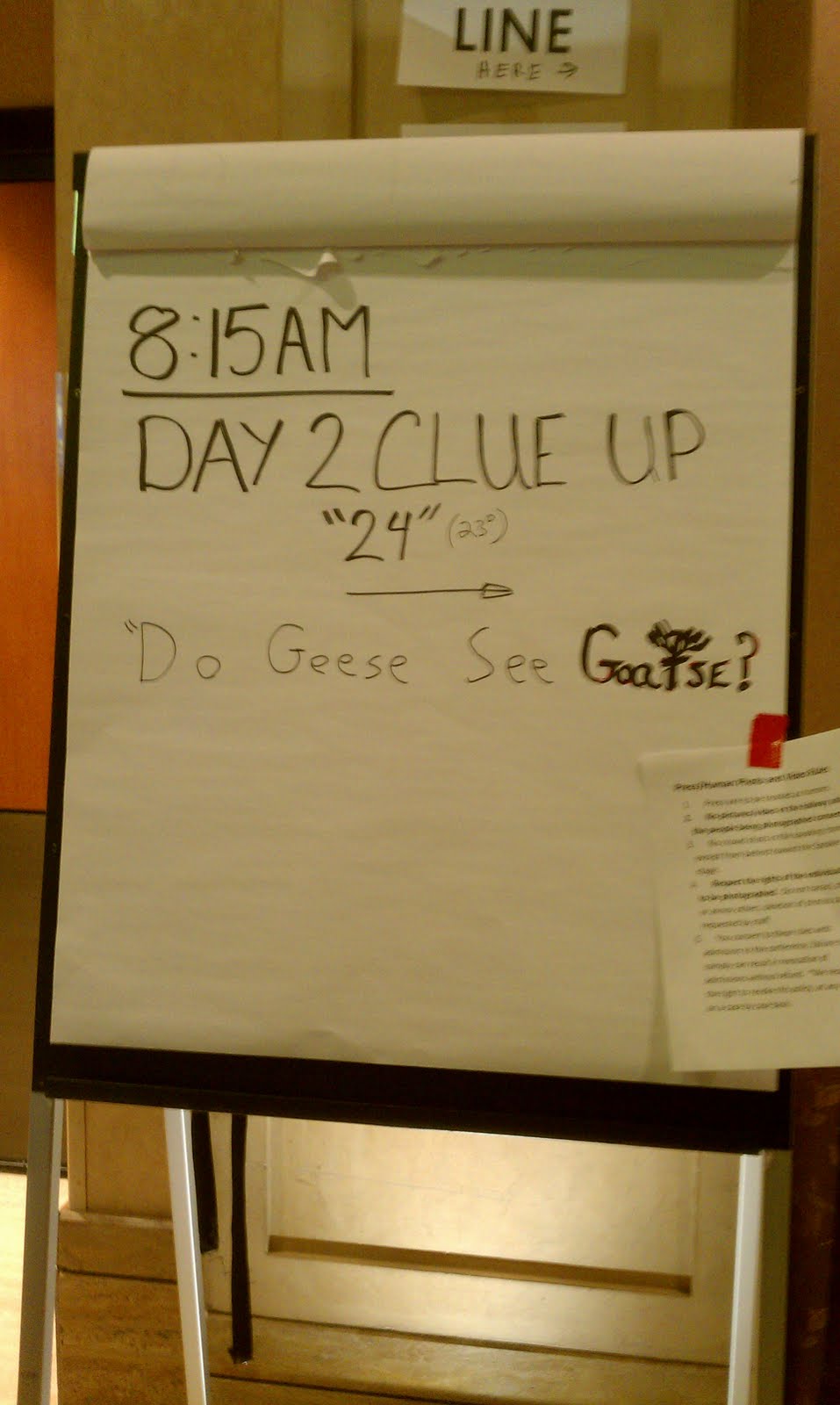 Ok, so the Z-Agents. We didn't go through this process ourselves; we only found out about it afterward. Above, the binary puzzle led to http://www.defcon.org/1057/NOPMYX. That page instructs you to find the Z agents (a handful of people with "Z" badges) and include the passphrase from earlier (The password is little sister) on an Ace of Spades card. They would give you a security question, which you would answer with "Every day is Halloween", and they would reply "Damn right", and they'd give you the next clue. I'd love to include some of the specific text, but the Defcon website is down today. (Did they get hacked? lulz.)