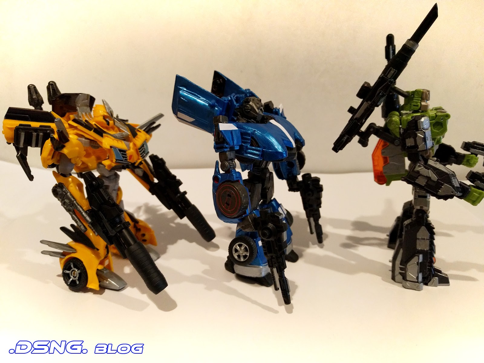 [image error] Today I'll show a group of five Transformers [with two different Bumblebee molds], in a Mexican standoff. I've shown most of them before, except for Hardhead [the green guy] and Brainstorm [the blue jet-looking guy]. They've all been customized in one form or another. My custom metallic blue guy, Turbo Blitz, was a repaint and a heavy modification of the Fall Of Cybertron Sideswipe. And I posted that article over Here.