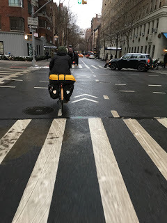 But a changed city also means new hazards. For example, the increasing ubiquity of Uber means more and more people standing in the middle of the street trying to figure out if that black car is actually for them. For example, as I was rounding one corner, I had to pick my way through a pair of bro-bags attempting to suss out a driver while looking up and down from their phones:
